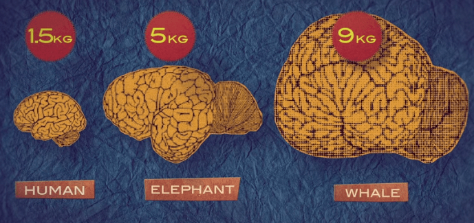 Human brain weighs 1.5kg, compared to an elephant brain weighing 5kg, a whale 9kg. Going downwards dog and mouse brain weigh in grams!